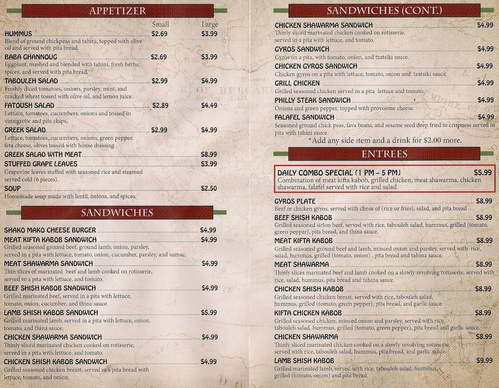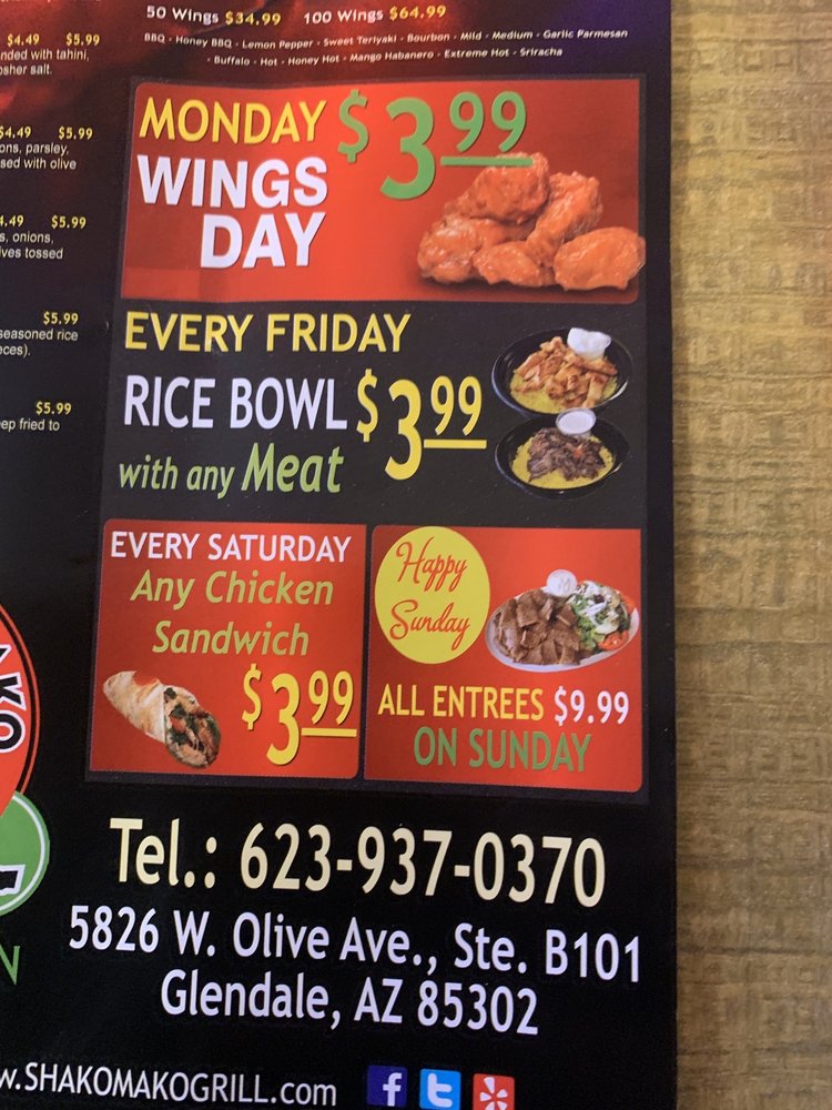 Introducing the menu at Shako Mako Grill, a delightful fusion of Middle Eastern and American cuisine located in Glendale, AZ. This casual dining spot excels in both flavor and accessibility, providing an array of options that cater to everyone, including generous vegetarian and vegan choices.